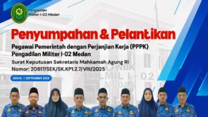 Kadilmil I-02 Medan Kolonel Chk Rony Suryandoko, S.H., S.I.P., M.Kn., menyumpah dan melantik 9 (sembilan) orang Pegawai Pemerintah dengan Perjanjian Kerja (PPPK) Pengadilan Militer I-02 Medan, kegiatan pelantikan dilaksanakan di Ruang Sidang Utama Pengadilan Militer I-02 Medan dan diikuti oleh seluruh personil Pengadilan Militer I-02 Medan.